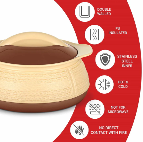– The casserole enhances the look of the dining table with its exclusive shape and design, and can be used for serving salads, chapatti, roti, curd making, and as ice-packs for storing ice-cream and custard.
