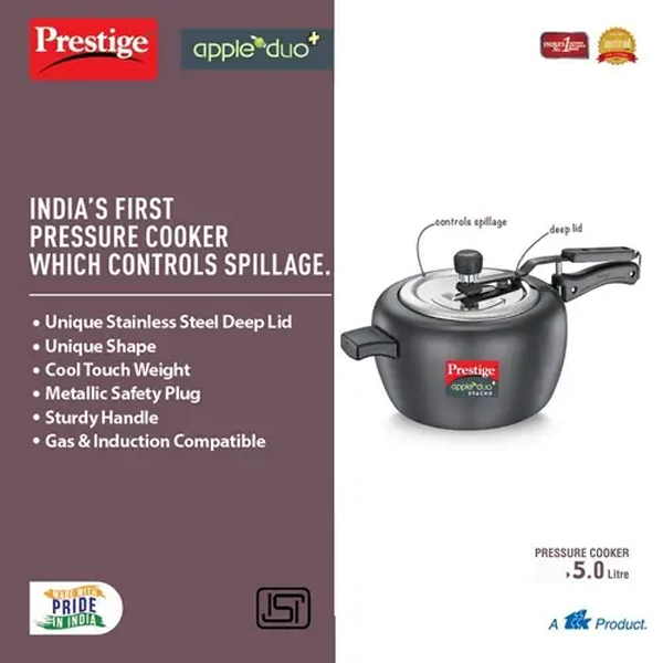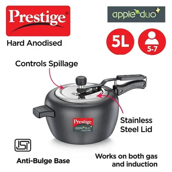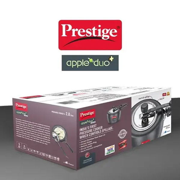 Bring home a revolutionary new cooker that completely transforms your kitchen experience, keeping you safe and happy in the kitchen. The Prestige Apple Duo Plus Svachh is a stunning new pressure cooker that you would want to flaunt at the dining table.