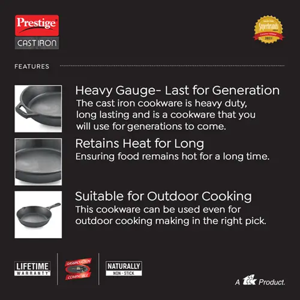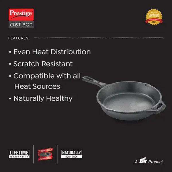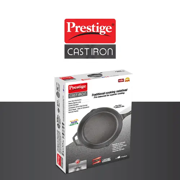 Presenting Prestige Cast iron, a range of contemporary cookware that helps you relive the original taste of food in a traditional way. This traditional cookware is compatible with all heat sources including gas, induction, firewood, ceramic, electric, halogen etc. that helps you cook and keep you cook and keep the food hot for a long time. Its pre-seasoned for a superior cooking experience. The right tool to sear, sautee, broil and fry makes it the best pick.
