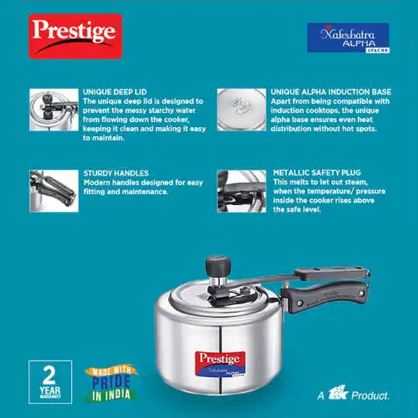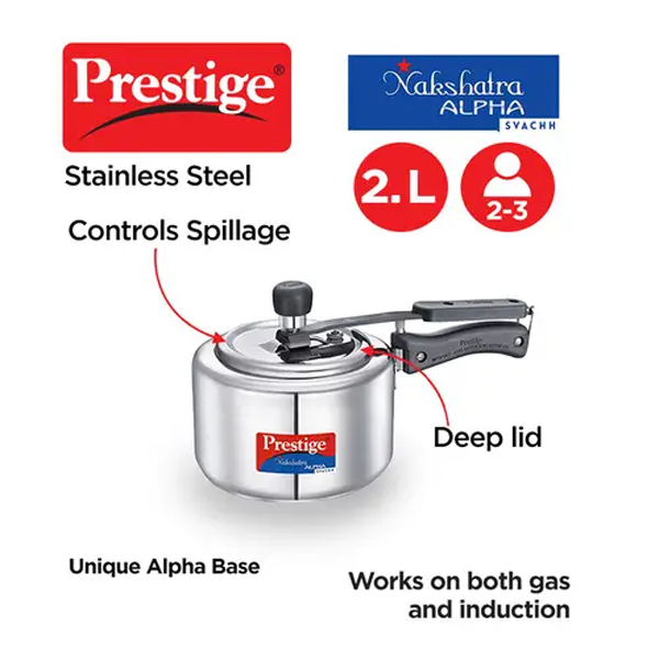 The all new Prestige Nakshatra Alpha Svachh stainless steel pressure cooker is designed and engineered for unmatched durability. This stunning pressure cooker comes with loads of features that include a heavy duty alpha base suitable for induction cooking as well as traditional cooking. The unique Svachh lid contains any spillage that might occur during the course of cooking, keeping your kitchen cleaner. With unbeatable safety features and stylish looks, Prestige Nakshatra Alpha Svachh stainless steel pressure cooker adds to the aesthetics of your kitchen.