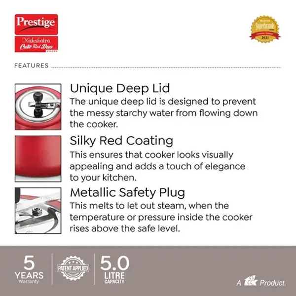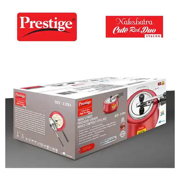 The only thing you need in your kitchen- Prestige Nakshatra Cute Red Duo Svachh understands you and all your cooking requirements. That’s the reason it is packed with top-notch features to truly sweep you off your feet. A wide base makes stirring easy and the unique Svachh lid contains any spillage that might occur during the course of cooking, keeping your kitchen safer and cleaner than ever before. Also, the cooker is gas and induction compatible. So go ahead and flaunt your impeccable cooking skills, only with this our Prestige Nakshatra Cute cooker that seamlessly blends into your lifestyle.