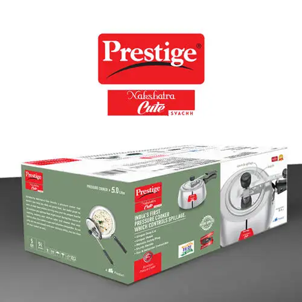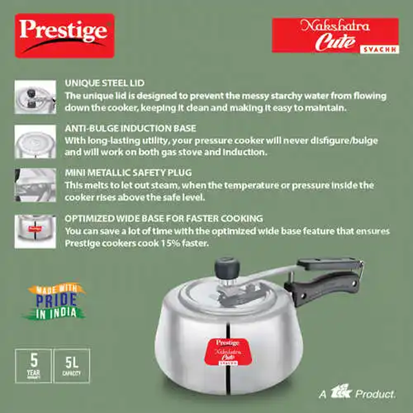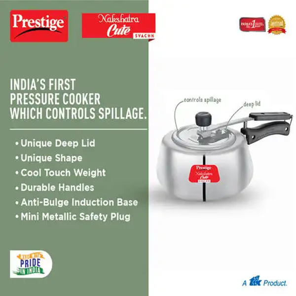 Introducing Nakshatra Cute Svachh aluminium pressure cookers by Prestige – a range of induction friendly pressure cookers that make your everyday cooking fast and easy. Ideal for pressure cooking dals/rice or vegetables on gas stoves and Induction top as well. Its unique base absorbs and retains more heat thus saving fuel while cooking. The specialy unique deep lid ensures that there no spillage while cooking. With Nakshatra Cute Svachh Pressure Cookers, all you have to do is put in your ingredients, place the lid, wait for the whistle and, hey presto- your cooking is taken care of.