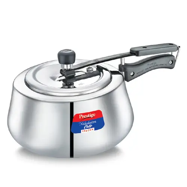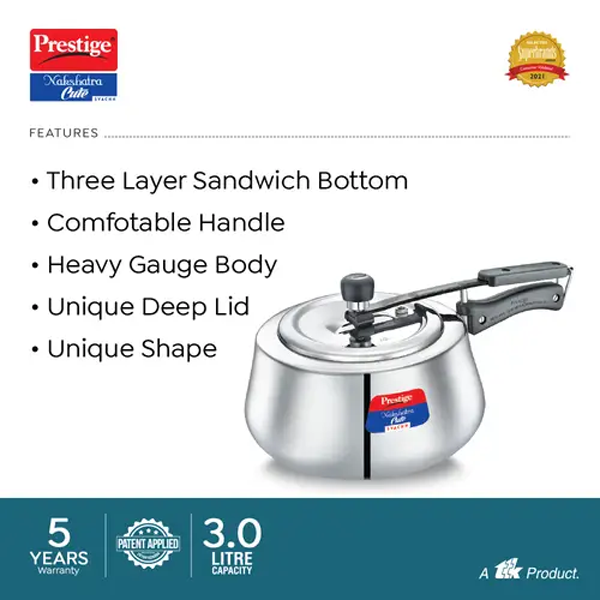 Introducing Nakshatra Cute Svachh, a pressure cooker that helps you dish out great food and looks stunning as well. The wide base makes stirring easy and the unique Svachh lid controls and contains any spillage that might occur during the course of cooking, keeping your kitchen safer and cleaner than ever before. The wide base is also more energy efficient for fuel saving and increases the speed of cooking. The three-layer sandwich bottom ensures even heat distribution and also prevents any hot spots. The heavy gauge body and the mini metallic safety plug ensures utmost safety. Now, you can impress people with your culinary skills and your cooker is going to fetch you amazing compliments.