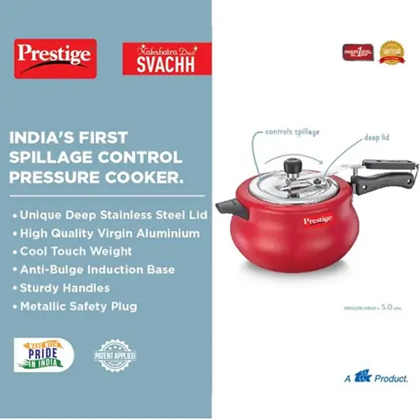 Prestige Nakshatra Duo Plus Svachh Aluminium Spillage Control Handi Pressure Cooker, 5 L (Red)