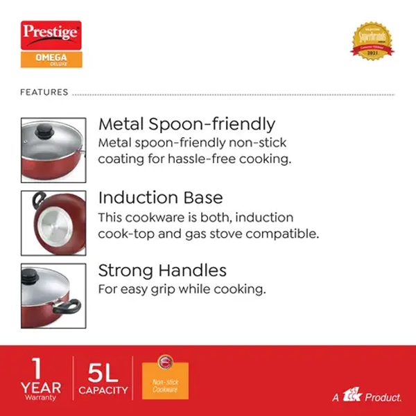 Prestige Omega Deluxe Aluminium Non-Stick Round Base Deep Kadai with Glass Lid (Red)