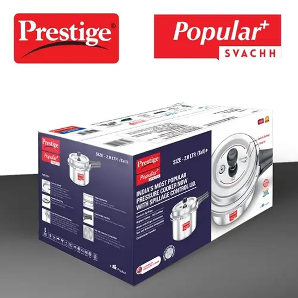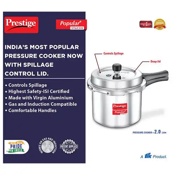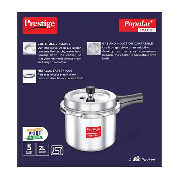 The Prestige Popular Plus Svachh Aluminium Pressure Cooker brings the best cooking experience to your kitchen. Its unique design helps you cook faster, and the innovative Deep-lid keeps your kitchen clean, at the same time. This pressure cooker comes with an induction base and a host of other top-of-the-line features. Manufactured from Virgin Aluminium to ensure zero contamination, the cooker boasts of high quality raw materials. Perfected over a period of time with the trademark Prestige engineering, expect the very best with up-to-date innovations and features. Add to that, the elegant design and splendid finish, the cooker is a sheer pleasure to cook with.