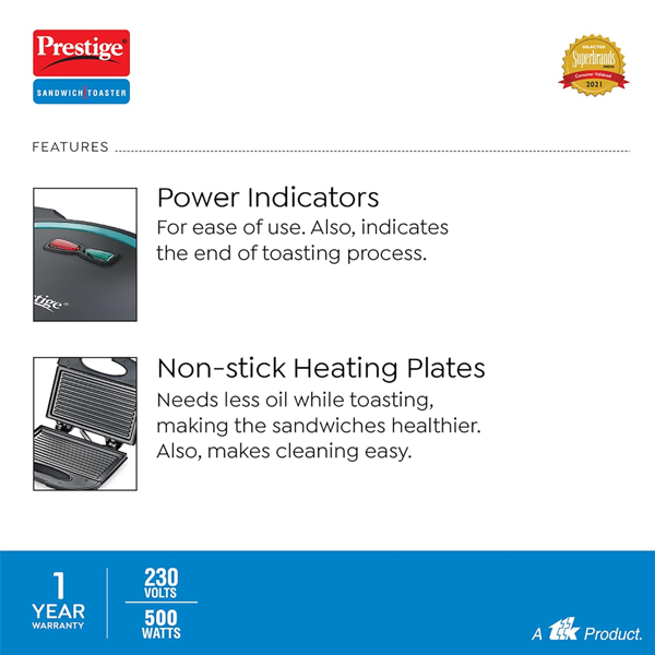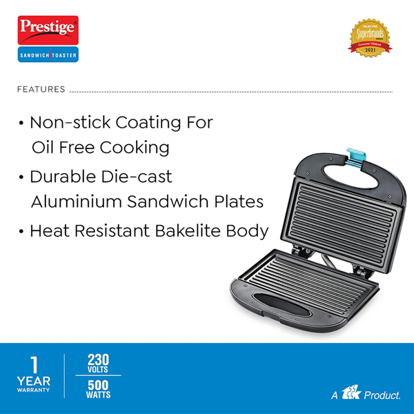 Prestige Sandwich Makers- Delicious toasted and grilled Sandwiches are now simple to make. Prepare healthy and tasty sandwiches in the convenience of your Kitchen. The Non-stick coated plates needs less oil while toasting making the sandwich healthy and easier to clean too. Choose from a wide range of Prestige sandwich makers to add a touch of class and convenience to your kitchen.