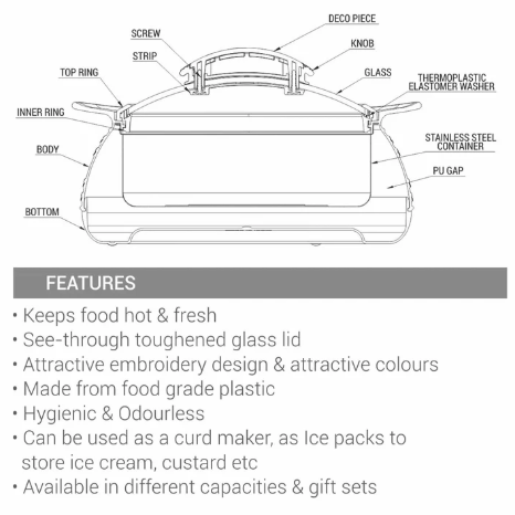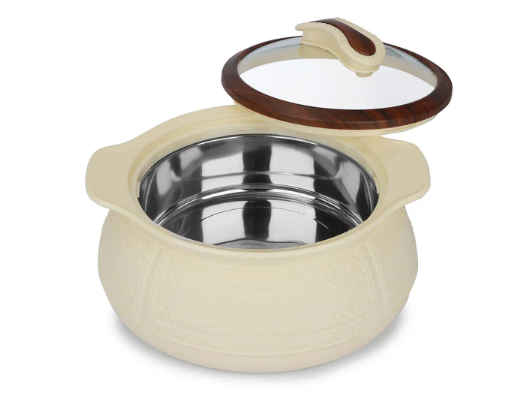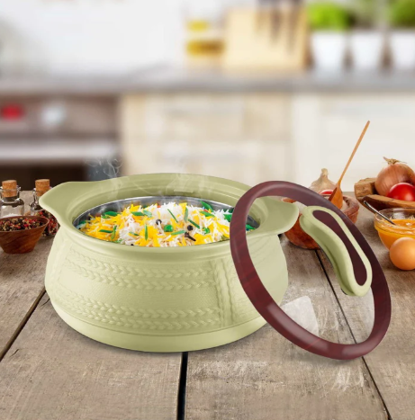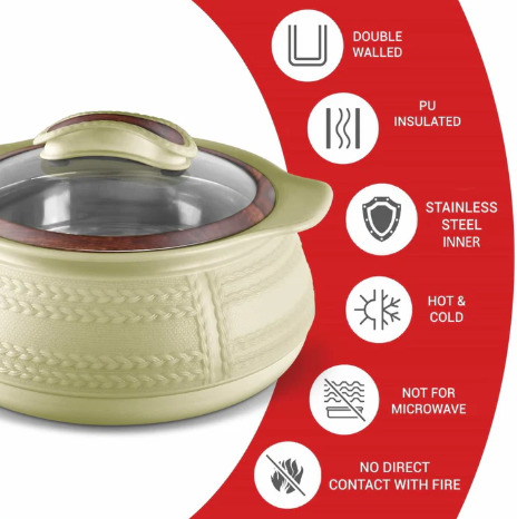 Double walled Inner stainless steel casserole keeps food hot and fresh for hours. Its sleek and attractive design (vacuum metallized / wooden prints) make it a must have to enhance your dining décor.